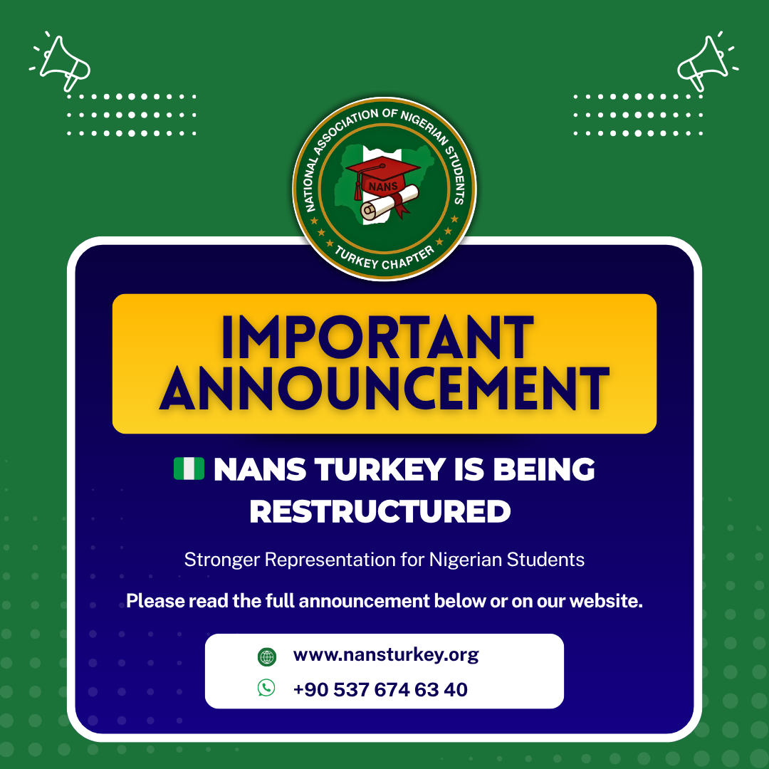 Major Announcement: NANS TURKEY is Being Restructured The National Association of Nigerian Students (NANS) Turkey Chapter is officially undergoing a major restructuring process to better represent and support Nigerian students across Turkey. This transformation is being carried out in close consultation with the NANS National Secretariat and the Nigerian Embassy in Turkey, ensuring alignment with national goals and global student standards. 🔍 What’s Changing? As part of […]